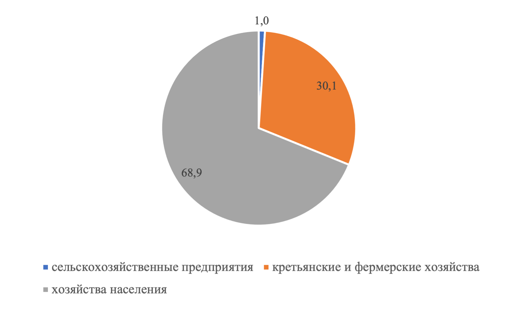 В периоде 2015–2019 гг. наибольшую долю в структуре валового производства продукции овощеводства занимали хозяйства населения (71,6 %) (рисунок 2). То есть основная часть овощей производилась на огородах, дачах и приусадебных участках, где производственные процессы во многом зависят от ручного труда. Это, в свою очередь, свидетельствует о мелкотоварности овощеводства в регионе (Абитов Е., 2025), а также о недостаточно высокой индустриализации сельского хозяйства региона.