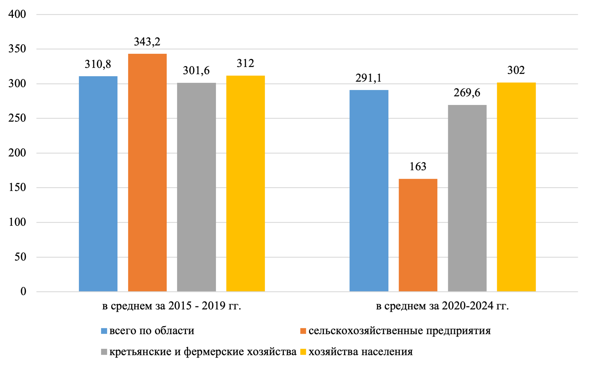 Если в период 2015–2019 гг. самая высокая урожайность зафиксирована в сельхозпредприятиях, то в период 2020–2024 гг. самую высокую урожайность продемонстрировали хозяйства населения, которых сохранили относительно стабильные показатели (снижение всего на 3,2%).